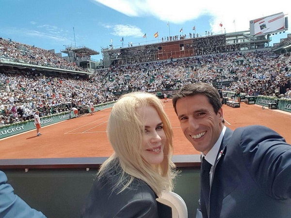 نیکول کیدمن و تونی استانگه (قایقران فرانسوی برنده سه طلای المپیک) در حال تماشای فینال تنیس اوپن فرانسه