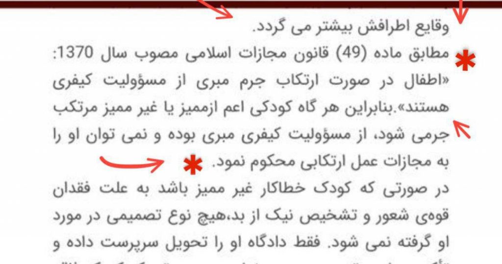این مادر به سن پایین دخترش اشاره میکرد و از برخورد مستقیم قانونی با او گلایه داشت: دختر 14 سالهی من طفل محسوب میشه! اطفال حتی اگر قتلی انجام داده باشند والدشان باید پاسخگو باشد! چند روز قبل انتخابات هم بوده. جوری بچهی من رو میزنن که مردم از پنجرهها هم واکنش نشون میدن! موبایل کسی که عکس گرفته هم میگیرن!