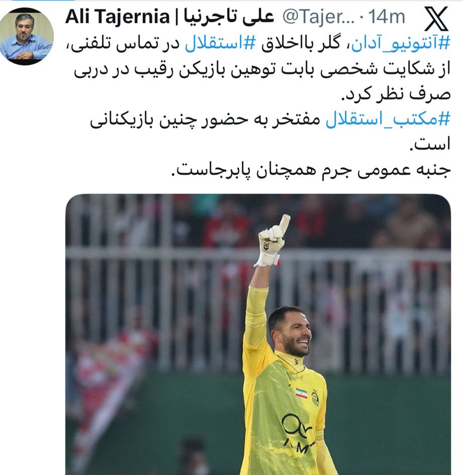بر اساس اعلام علی تاجرنیا، آنتونیو آدان، دروازه‌بان استقلال، طی یک توئیت از شکایت شخصی خود علیه بازیکن رقیب (سروش رفیعی) بابت توهین صورت گرفته در جریان دربی صرف نظر کرد.