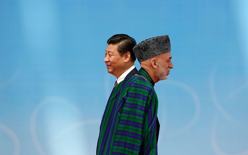 حامد کرزای رییس جمهور افغانستان در حال عبور از کنار شی جن پنگ رییس جمهور چین در اجلاس سران آسیا (سیکا) در شانگهای چین.